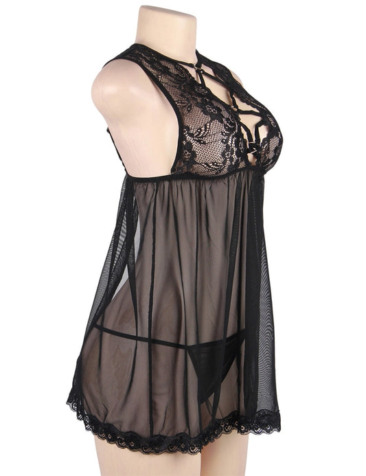 Sheer Mesh Front Lace Up Chemise in Black - Lovely Lies