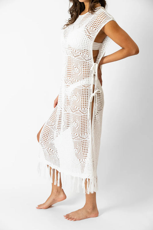 Santorini Fringe Open Knit Dress In Cream - Koy Resort