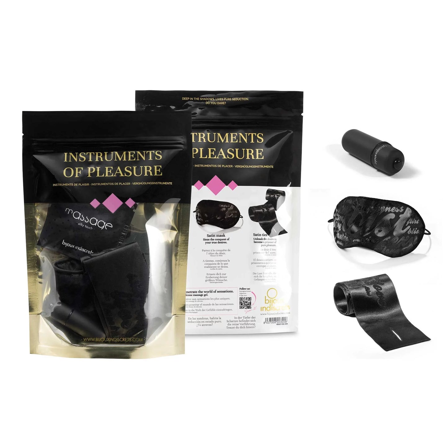 Content: satin restraints, satin eye mask, silicone gel and vibrating bullet. External use only.