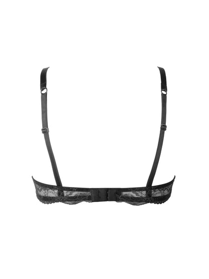 Soft underwired half-cup bra in Calais lace with a horizontal cutout. This bra offers a feminine rounded neckline. Embroidered cups with guipure inlay and rhinestones. Fine adjustable straps for more femininity and lightness. Delicate satin bow and mask with rhinestones at center gore.Â