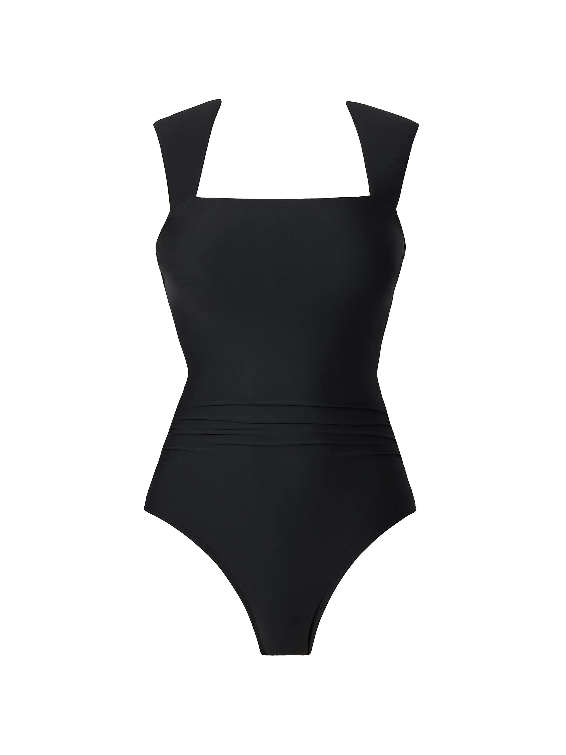 The Solid Wren One Piece Swimsuit's squared neckline accented by shoulder pads create a sleek, sculpted look. Shirring smooths the bodice, while a portrait back with adjustable closure completes the silhouette.