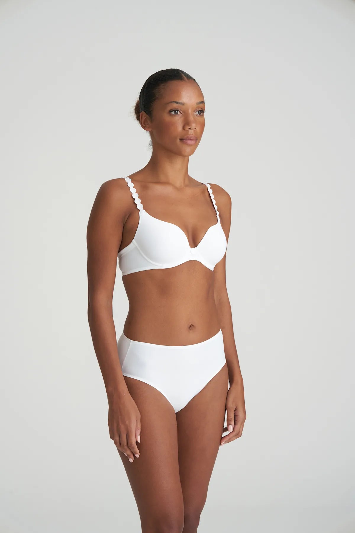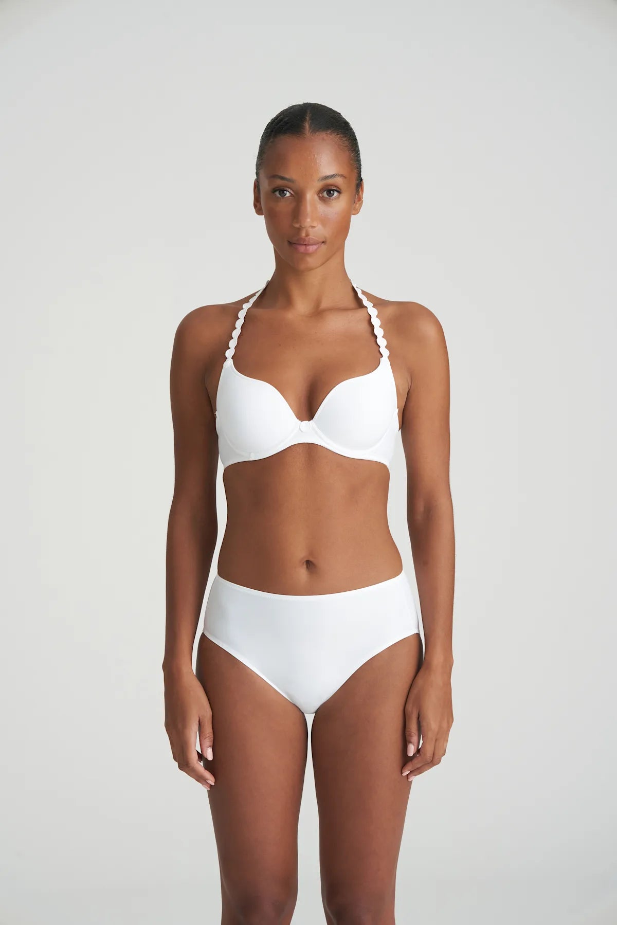 Un soutien-gorge rembourré avec des bonnets en forme de cœur. Les bonnets offrent une excellente couverture en haut. Le soutien-gorge est coupé haut sur le haut des bonnets puis plonge dans un profond décolleté entre les seins. Le tulle transparent au dos est coupé droit. Les bretelles peuvent être portées sur les épaules ou autour du cou.