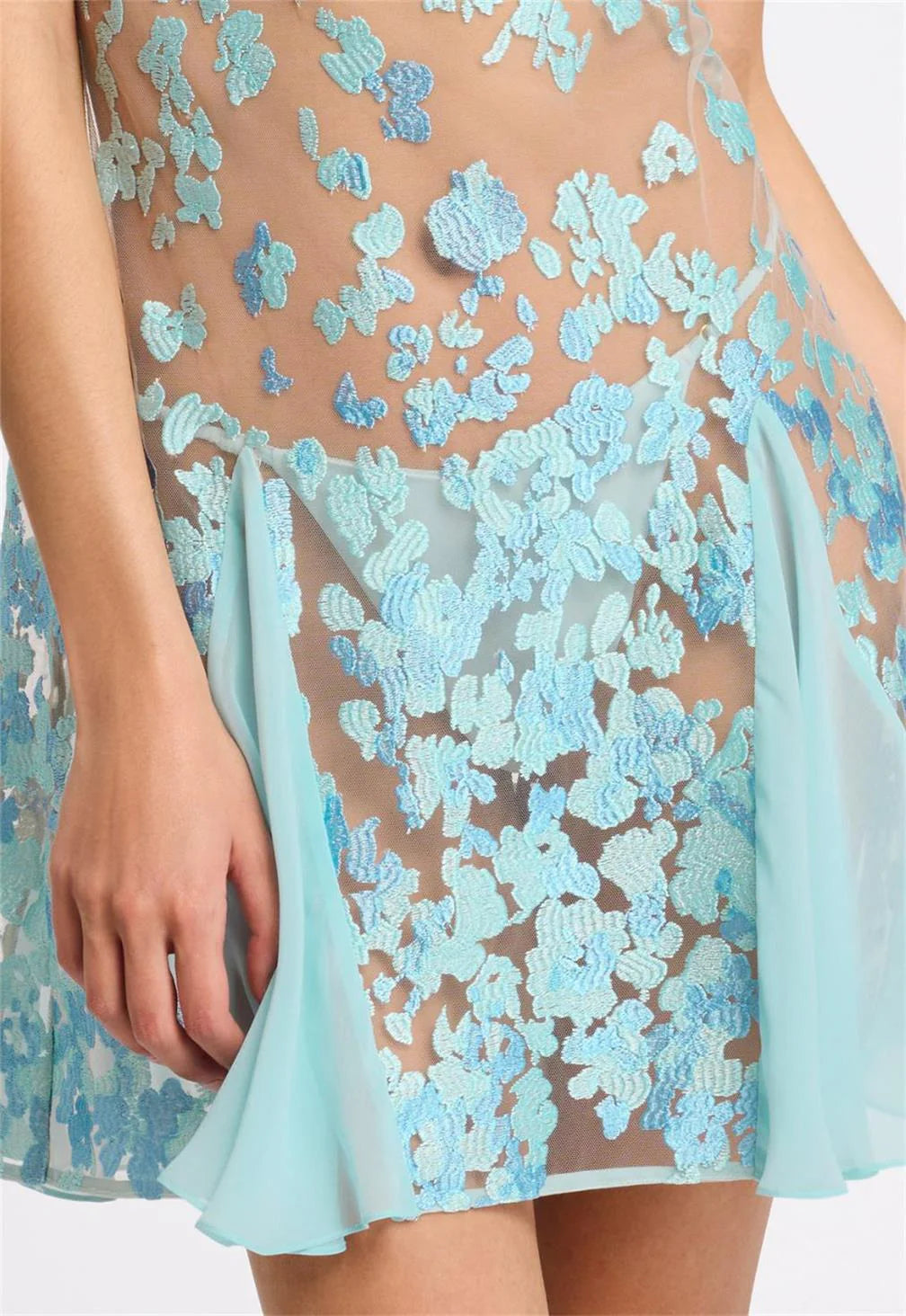The Vija Chemise is the epitome of artistry. It's delicately draped bustline compliments the splash of movement with its godets at the hem. Its colorful embroidery crawls up the body, revealing a sheer underlay and matching thong. Feminine and fashion-forward, this chemise entices for more.