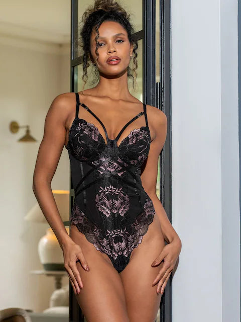 After Hours Underwire Thong Black Bodysuit In Black & Soft Pink - Pour Moi