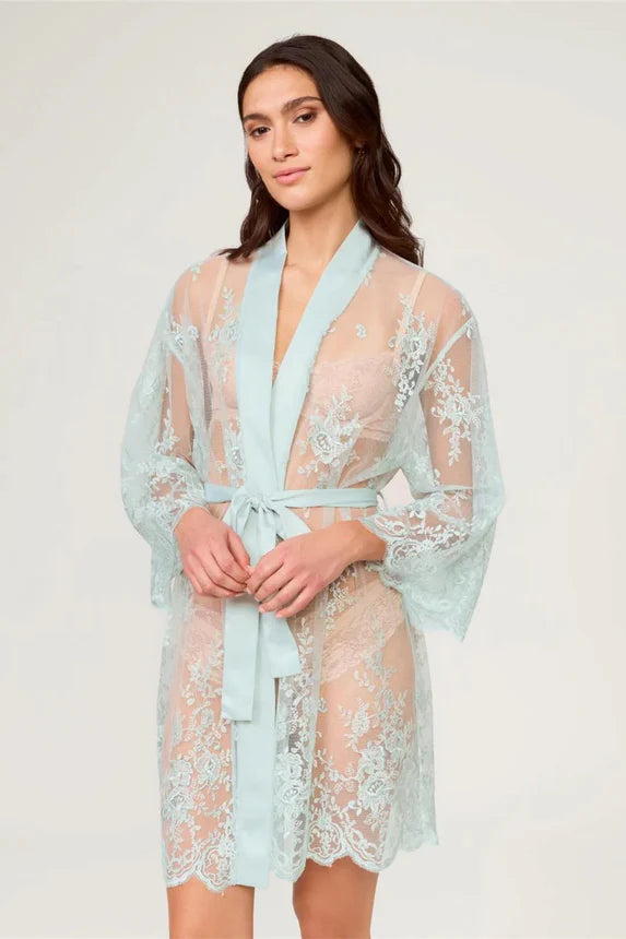 This delicate allover embroidery cover-up is perfect for layering over any lingerie piece. Pair it best with our Darling Chemise.