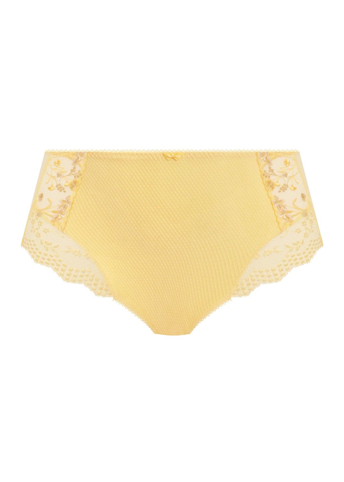 Introducing the perfect mix of sour and sweet with Elomi Charley Full Brief in our sunshine yellow Lemon Fizz hue. Featuring timeless floral embroidery with a subtle metallic shimmer along the side panels, this collection will have you sparkling like a springtime gem wherever you go. With an adorable bow detail at the centre front for an added touch of charm.
