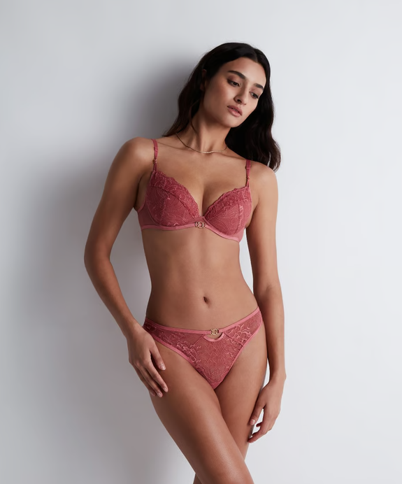 Ideal for anyone looking for zero VPL, the Feeling tanga brief combines refined floral lace with soft, see-through tulle in a shape that is both comfortable and flattering. At the front, a sexy opening trimmed with a gold charm adds an extra flirtatious touch to this piece that is designed with sensuality in mind.