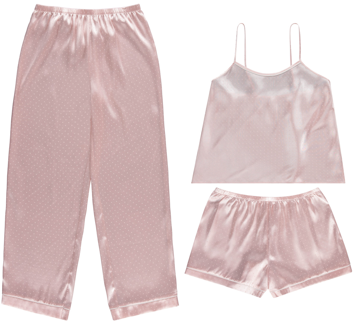 Tonal pin dots lend dimension to this satin PJ set that pairs a cami with tap shorts and pants so you'll always sleep comfortably, regardless of the temp.