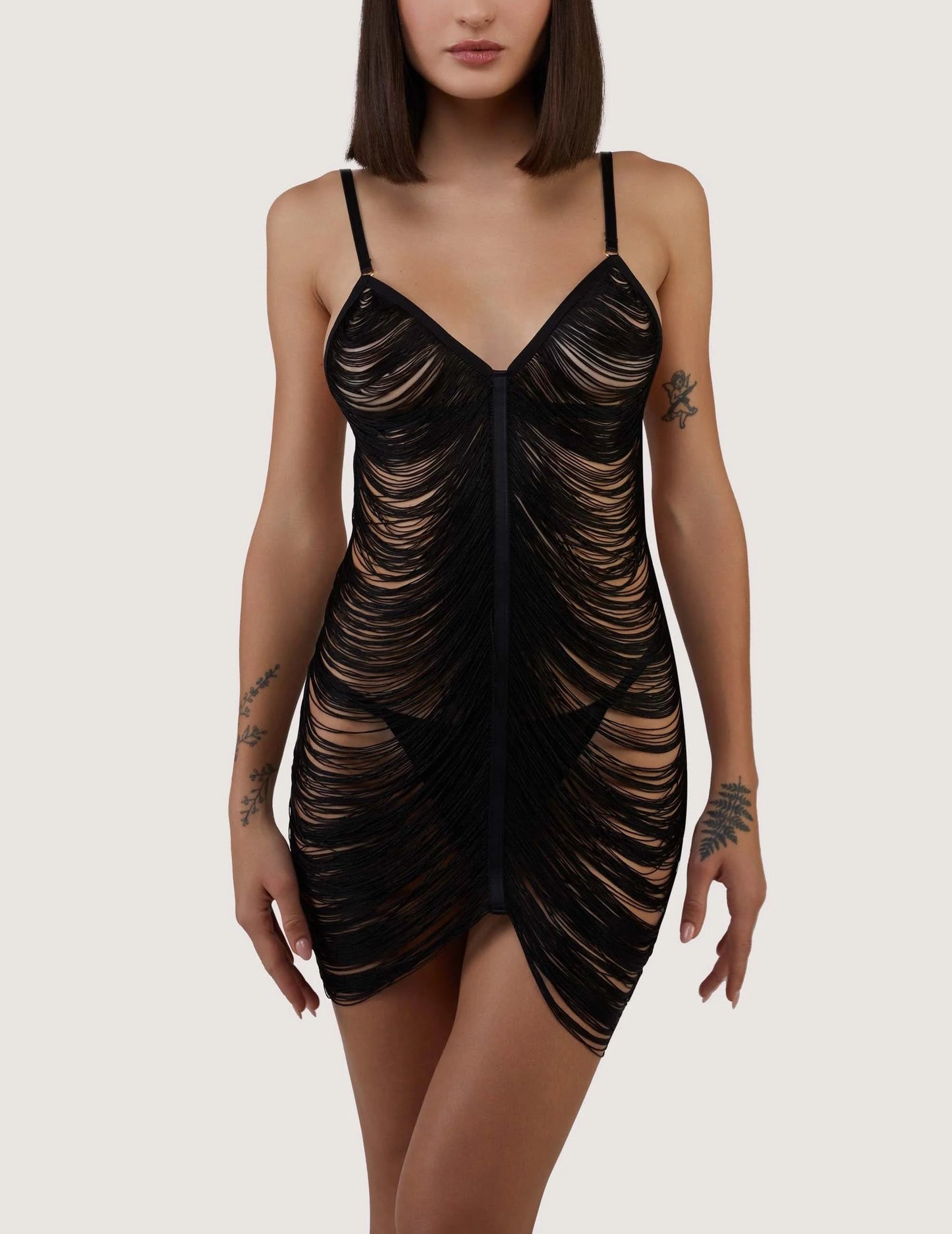 Elevate your wardrobe with the sizzling-new Wolf & Whistle Kiera Black Fringe and Chain Bodysuit Dress. Infuse your look with cheeky charm in this fresh black ensemble, featuring flirtatious fringe and daring chain details.