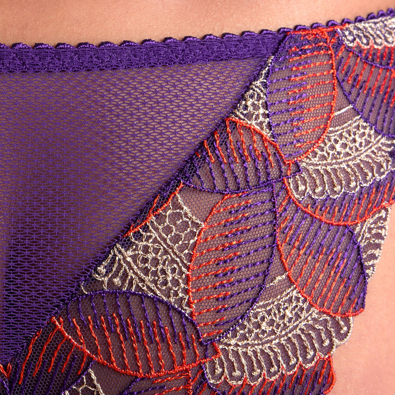 Indulge in the vibrant elegance of the Life Celebration Mini Coeur Brief by Aubade, now available in a striking Vivid Purple hue. This exquisite piece features rigid embroidery with metallic threads made in Switzerland, complemented by delicate fancy fishnet panels that offer a seductive glimpse of skin. Designed for both beauty and comfort, the brief provides partial back coverage with seamless thigh openings, ensuring a smooth silhouette under clothing. The elasticated waistband and a gold-plated zamak button, crafted in France, add luxurious finishing touches.