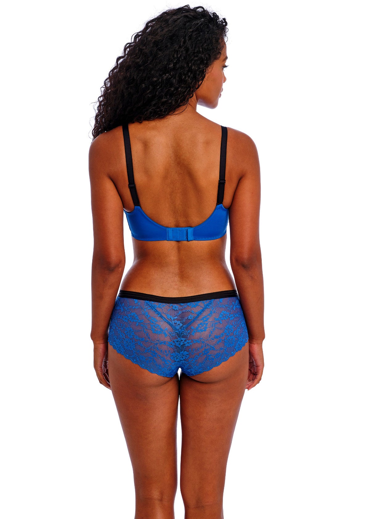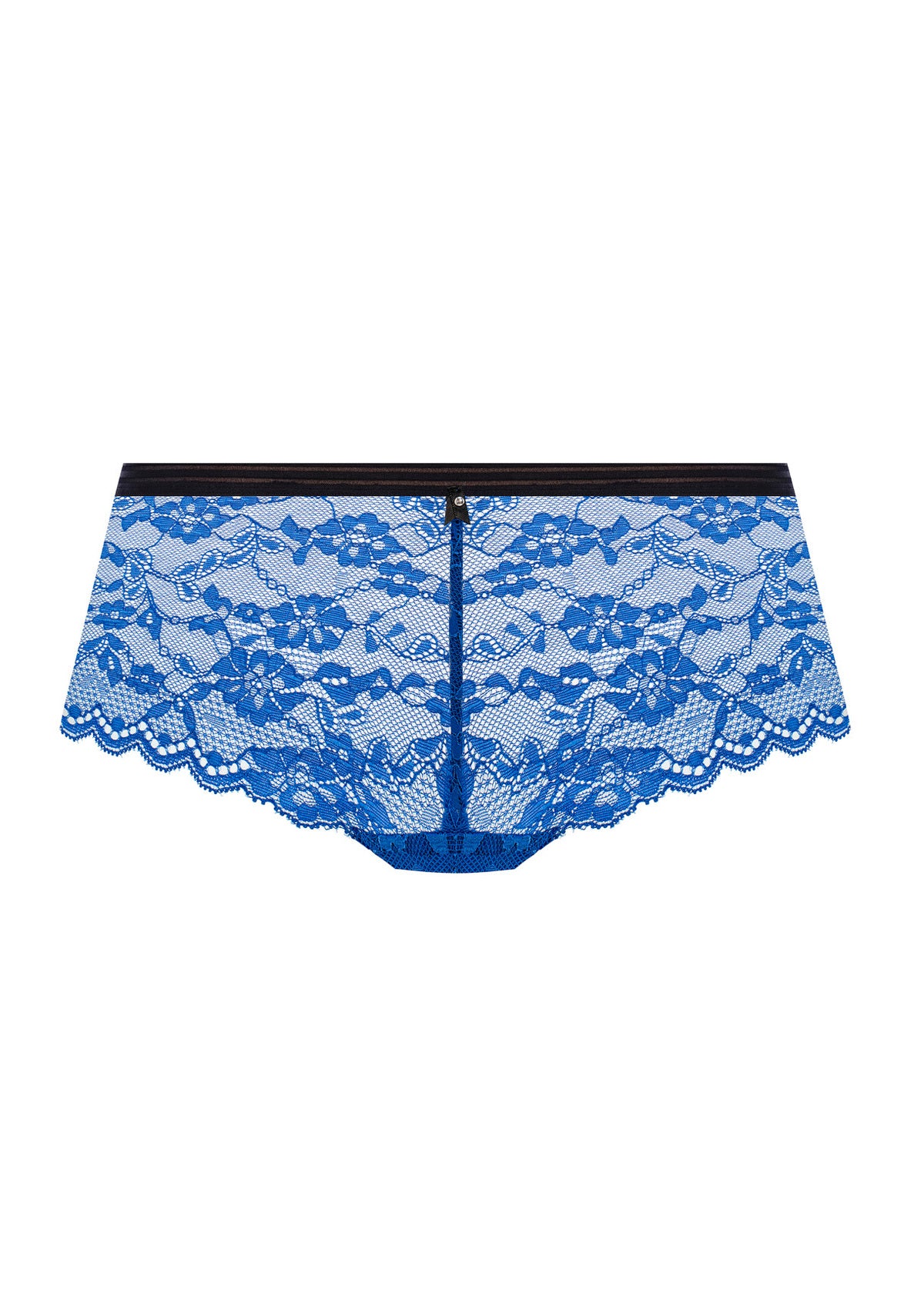 For slightly more modesty, opt for Freya's Offbeat Short in Dazzling Blue. Featuring beautiful stretch lace along the front and back with scallop edge detailing to offer style and comfort. Complete in an electrifying Blue colourway with a contrasting black waistband