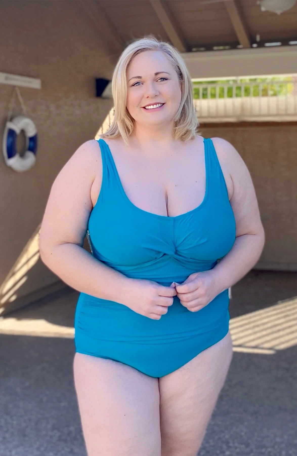 Maxine of Hollywood's plus-size twist front one-piece swimsuit amps up your swim style. This piece features a twist neckline, adjustable straps, and finishes with fabric shirring. Built-in tummy toner and molded cups are included for elegant support.
