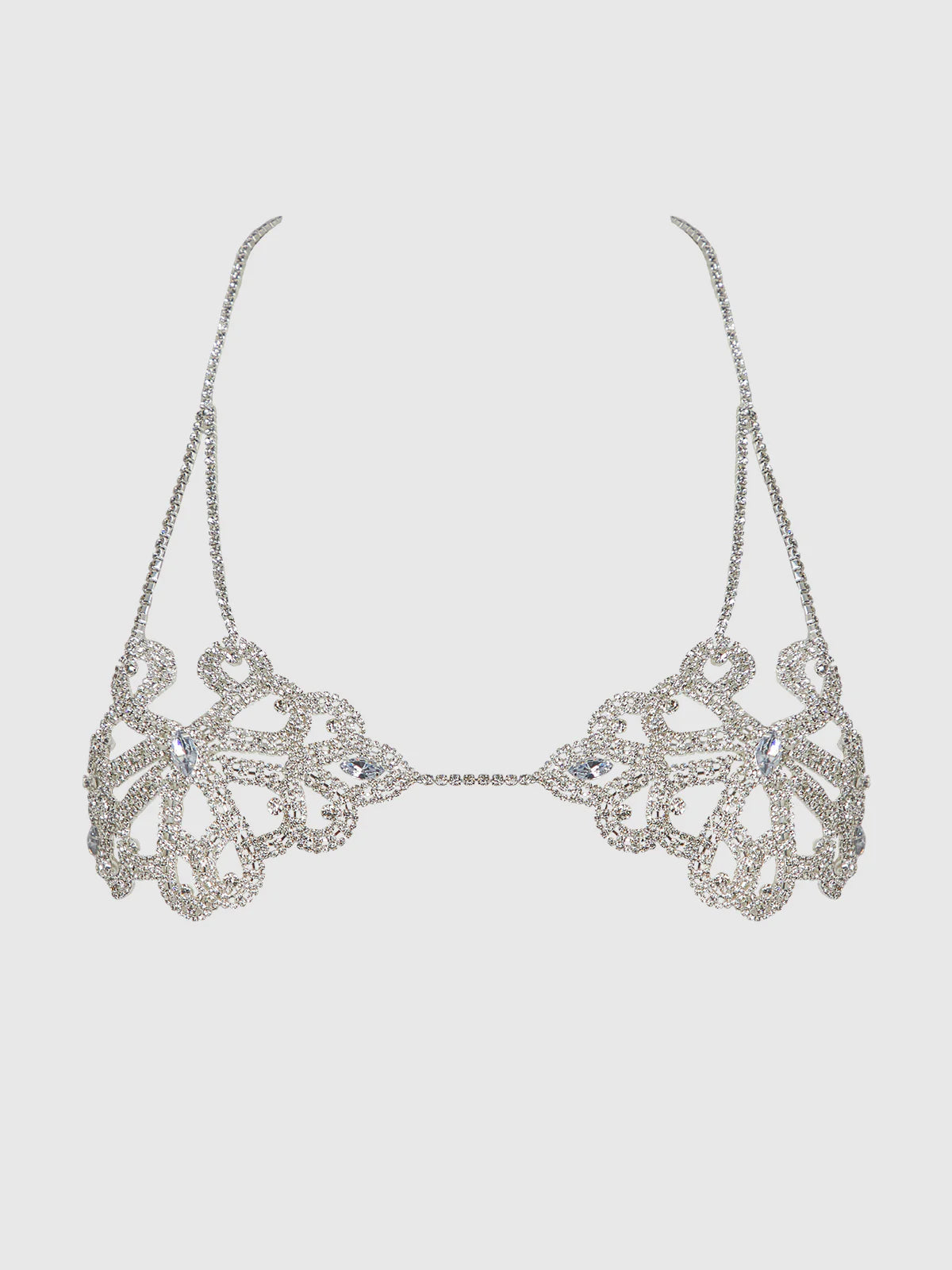 - Rhinestone-embellished bralette with ornate swirl cups.
