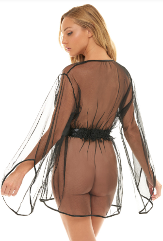 - Tulle short robe with wide sleeves, back embroidered applique and functional attached satin sash
