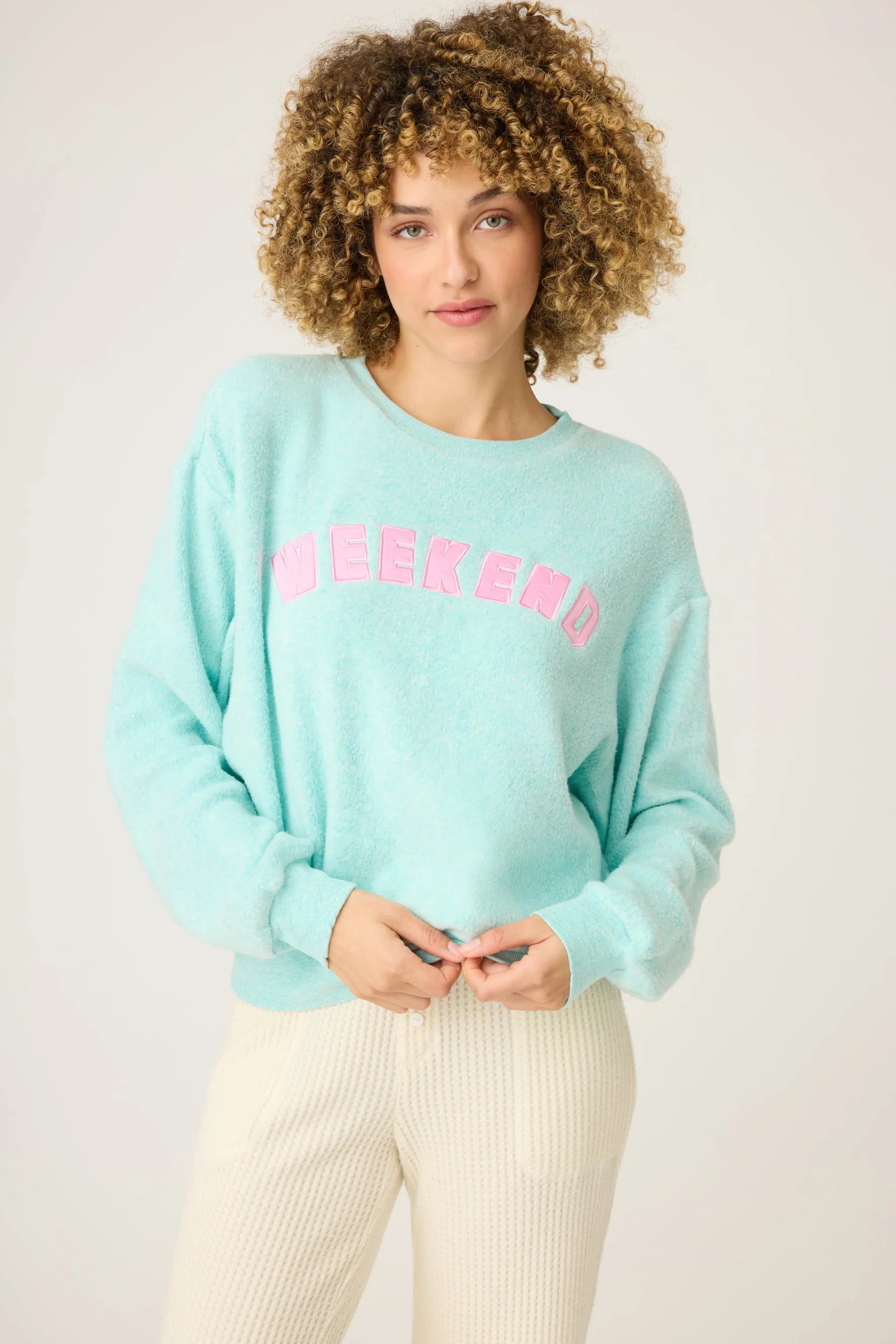 Made for weekend-ing, this soft mint crewneck sweatshirt features a pink boucle “Weekend” graphic in boucle with a relaxed fit and ribbed trim at the collar, cuffs, and hem. Made from cozy cloud-brushed cotton-modal terry, it's perfect for everything from casual Saturdays and Sundays outings to couch-rotting at home.