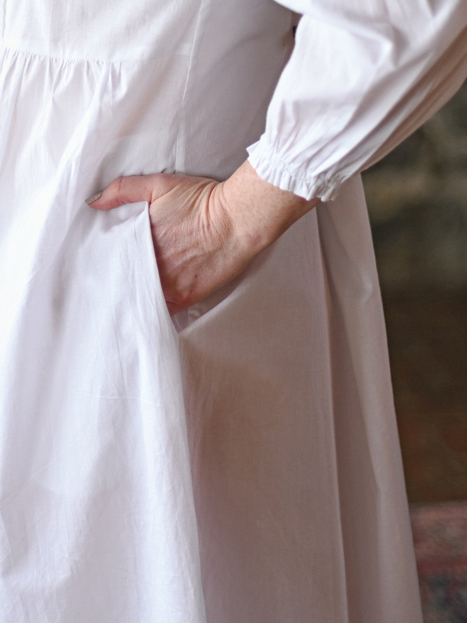 There's nothing like the look and feel of April's natural cotton nighties, they get better with age and they always make you smile. Crochet trim, mother of pearl buttons, side seam pockets.