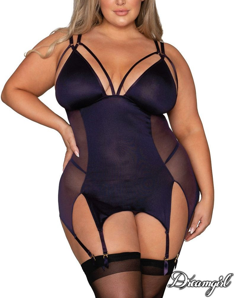Step into elegance with a sheer mesh garter slip featuring a silky microfiber front, strappy elastics around soft triangle cups, and adjustable double straps. The piece is complete with adjustable double garters and a hook & eye back closure.