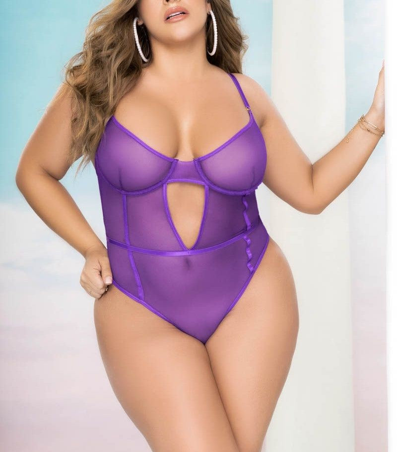 This sheer mesh teddy is adorned with a silky strappy elastic overlay, featuring adjustable straps, underwired cups, two hook & eye back closures, and a practical crotch closure for ease of wear.