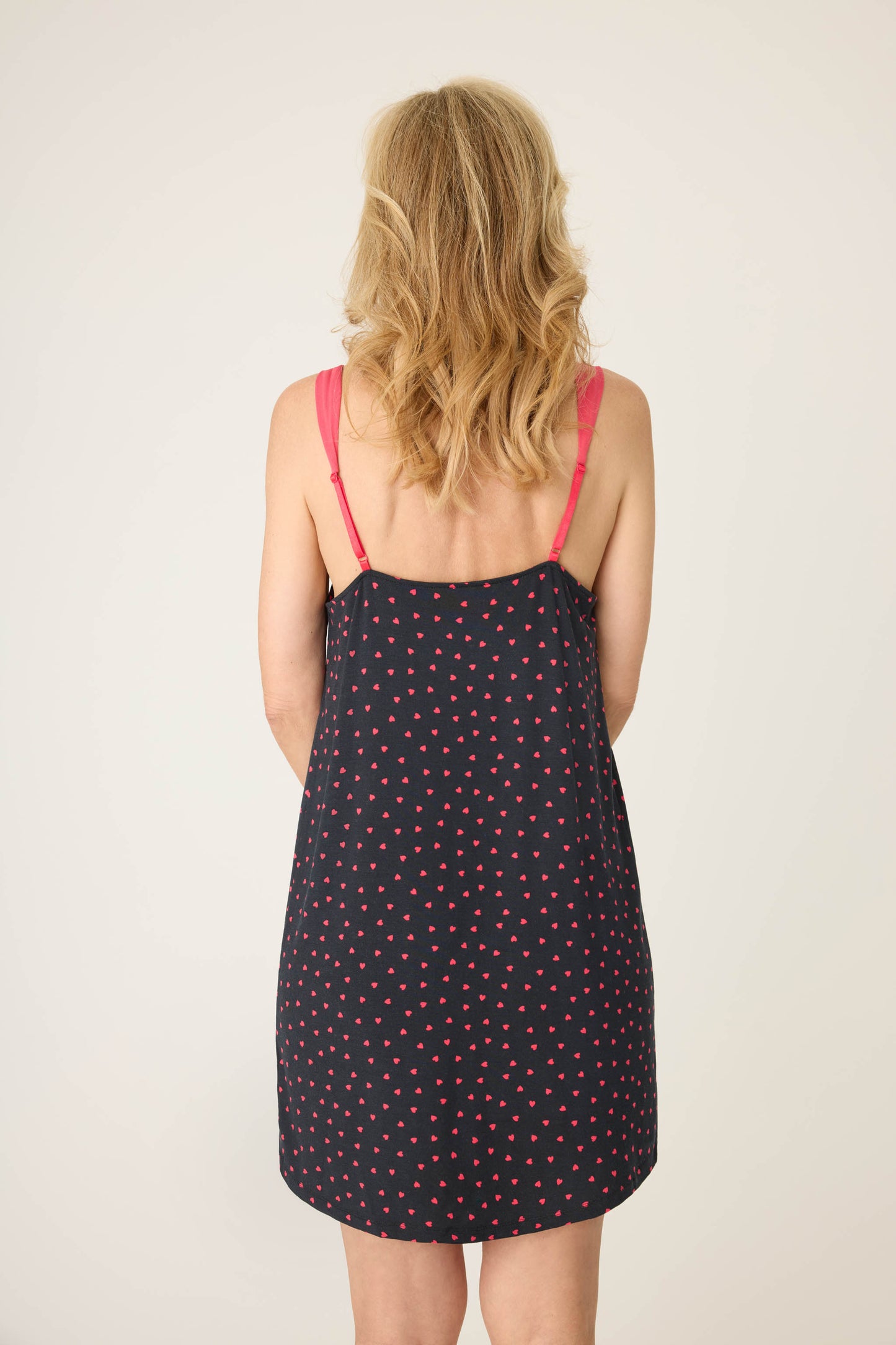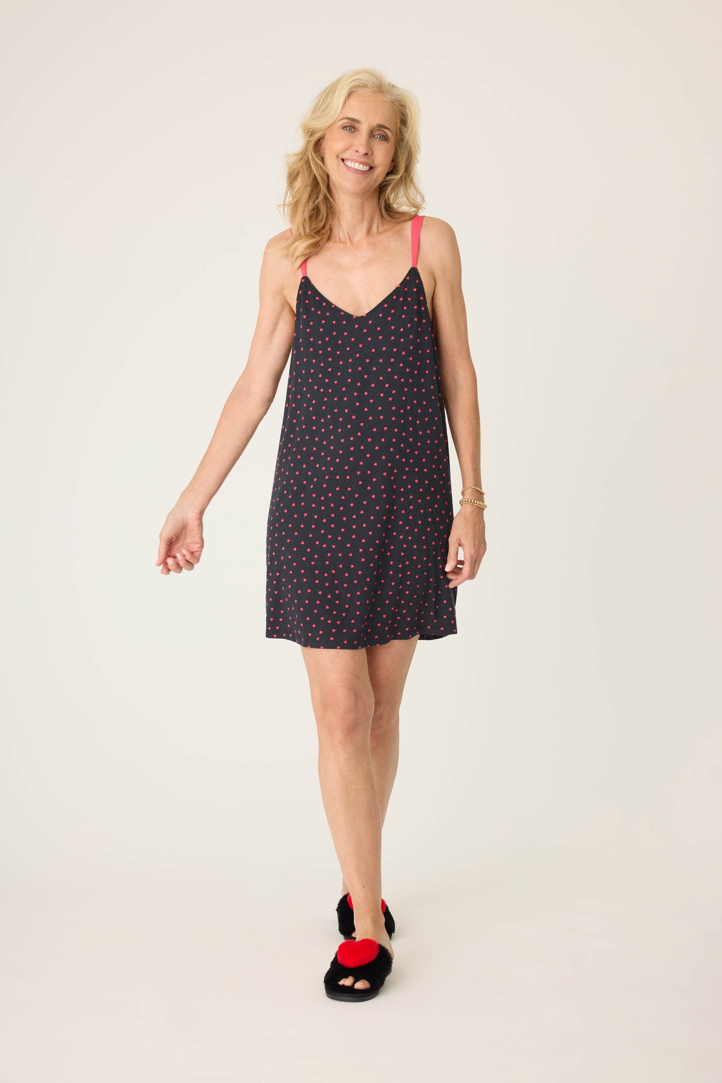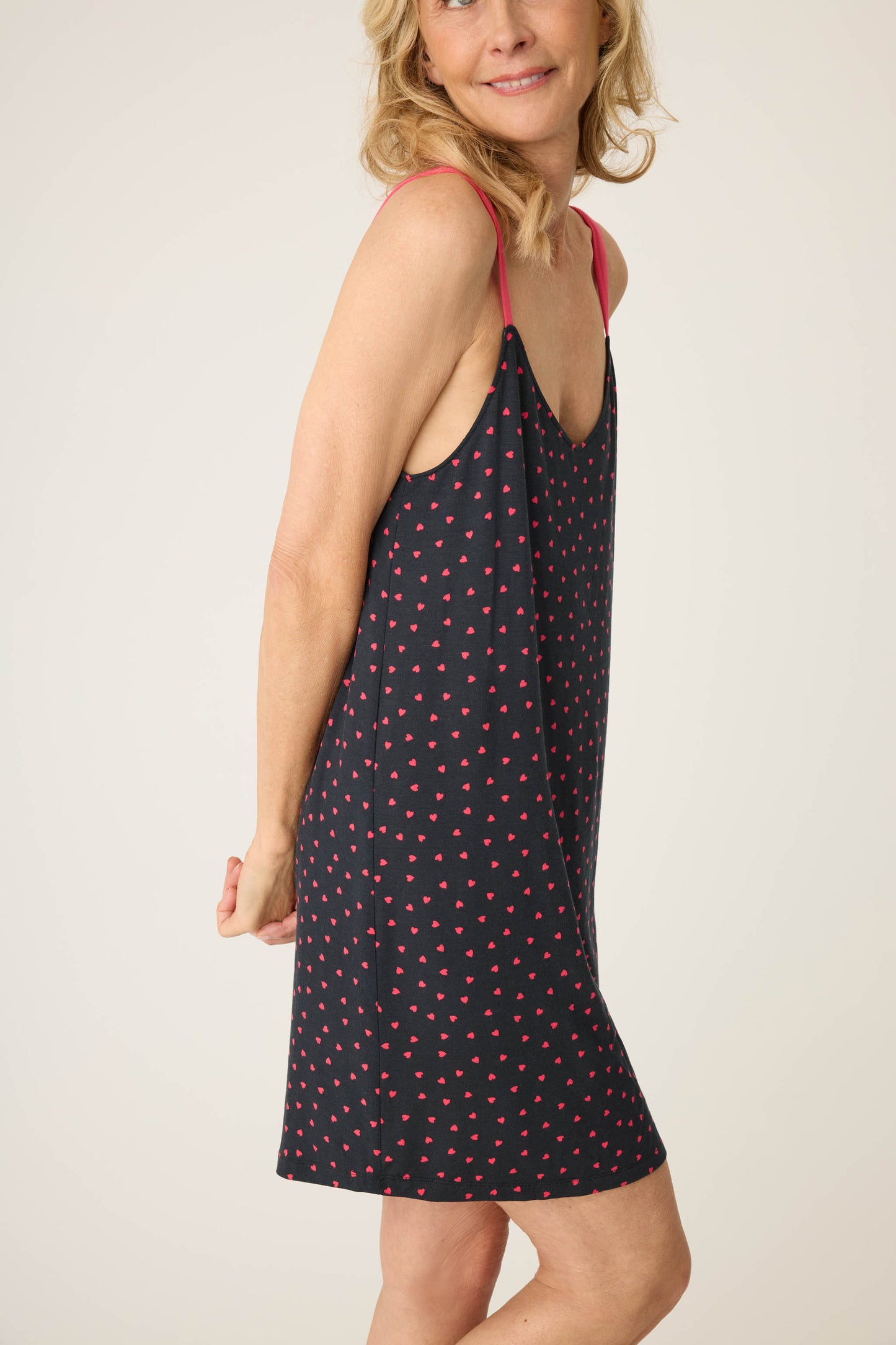 Fall in love with this soft, stretch-modal chemise adorned with charming heart prints and featuring adjustable straps for the perfect fit.