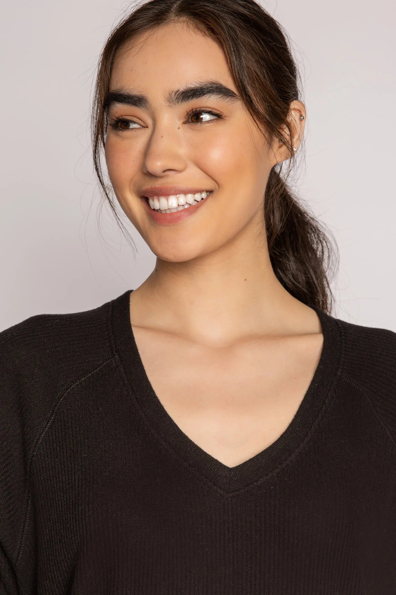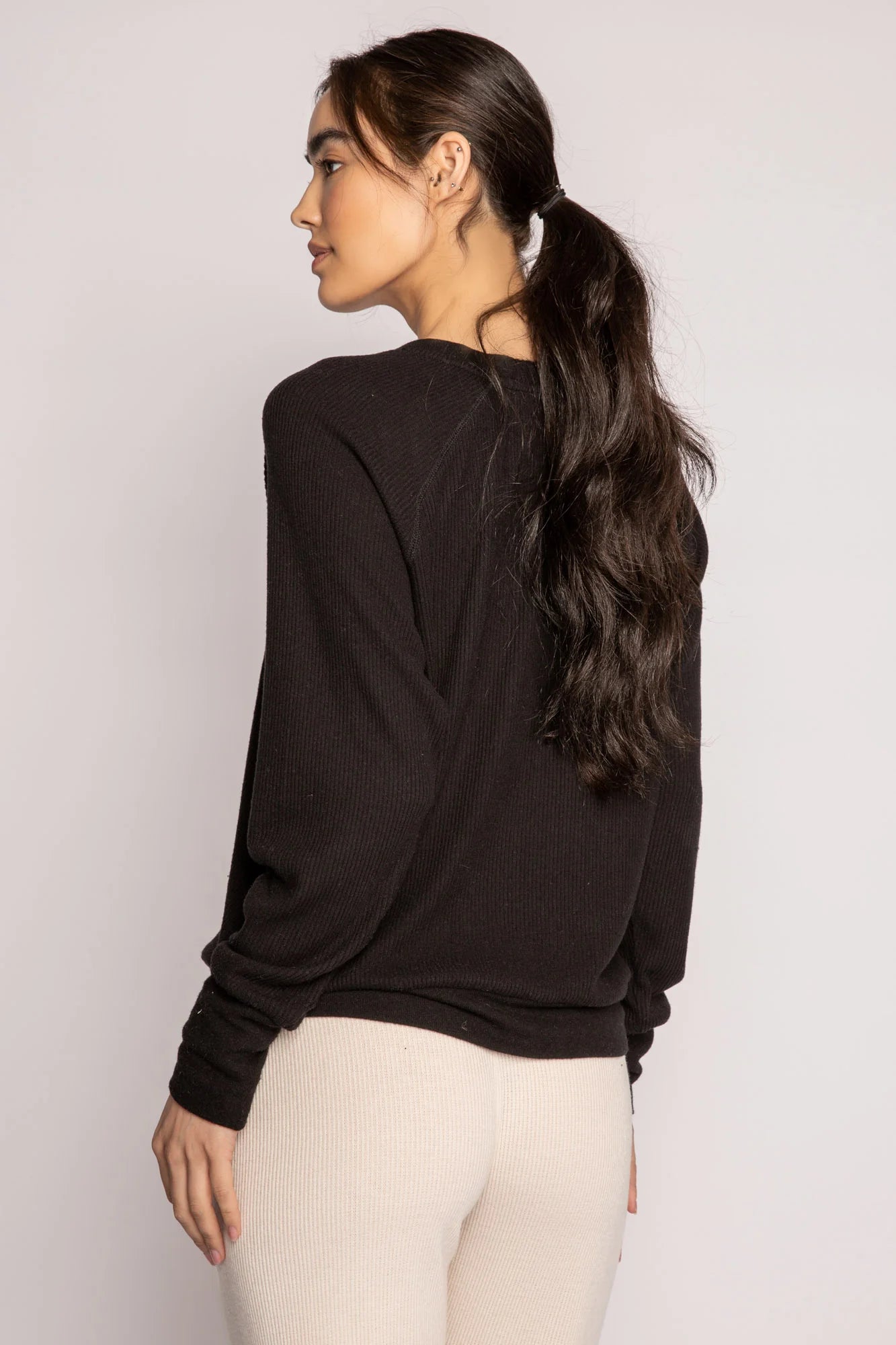 Our newest V-neck long sleeve top. Softly ribbed and relaxed - a perfect shape to layer with joggers or any denim. Designed in classic black 2x2 rib. Model is 5' 10", wearing size small.
