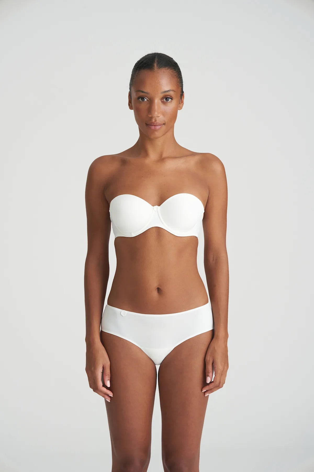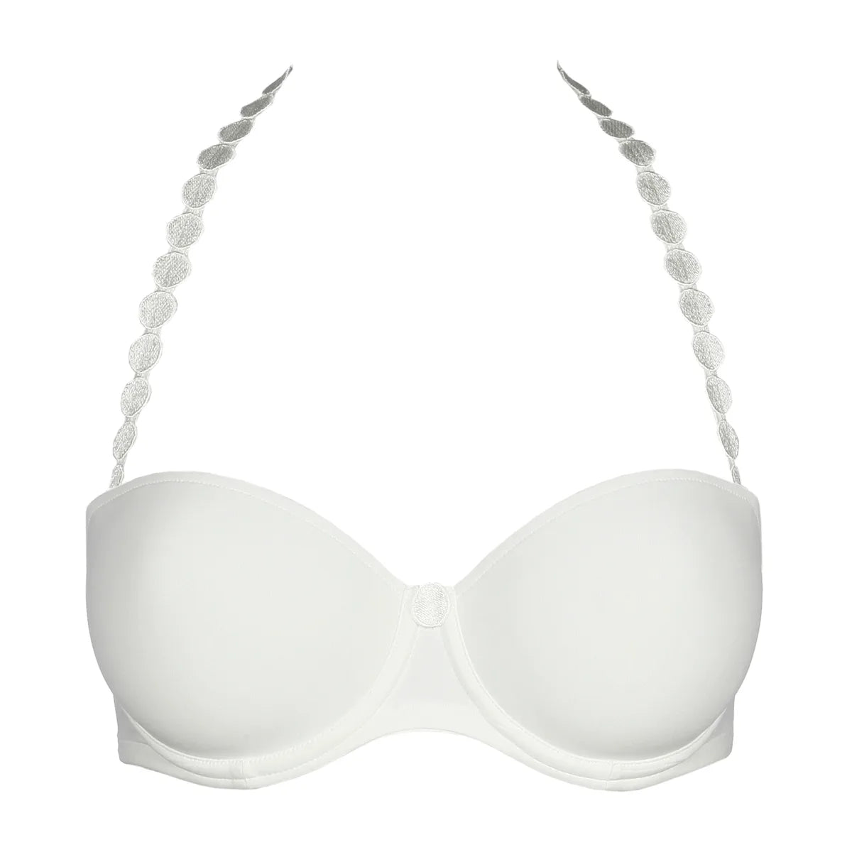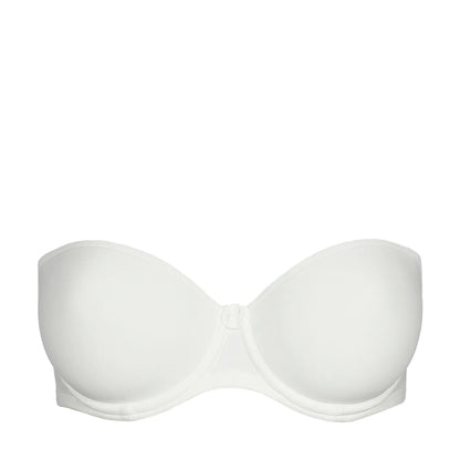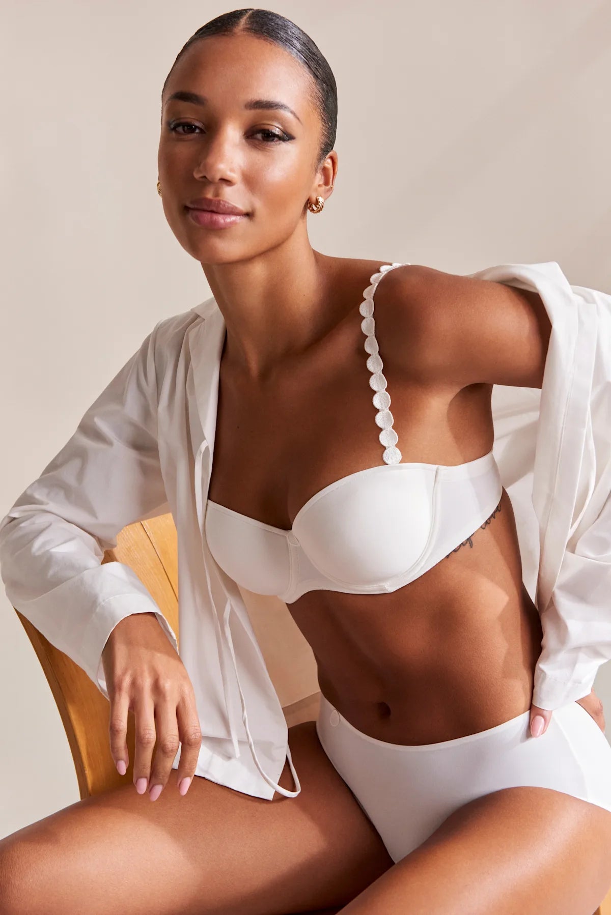 A strapless bra with the shape of a bandeau style. This bra has a straight back and a wide band made from stretch fabric for added support. Wear as a strapless bra or wear the straps over the shoulders or around the neck. A subtle softer take on white, Natural looks great against any skin type.