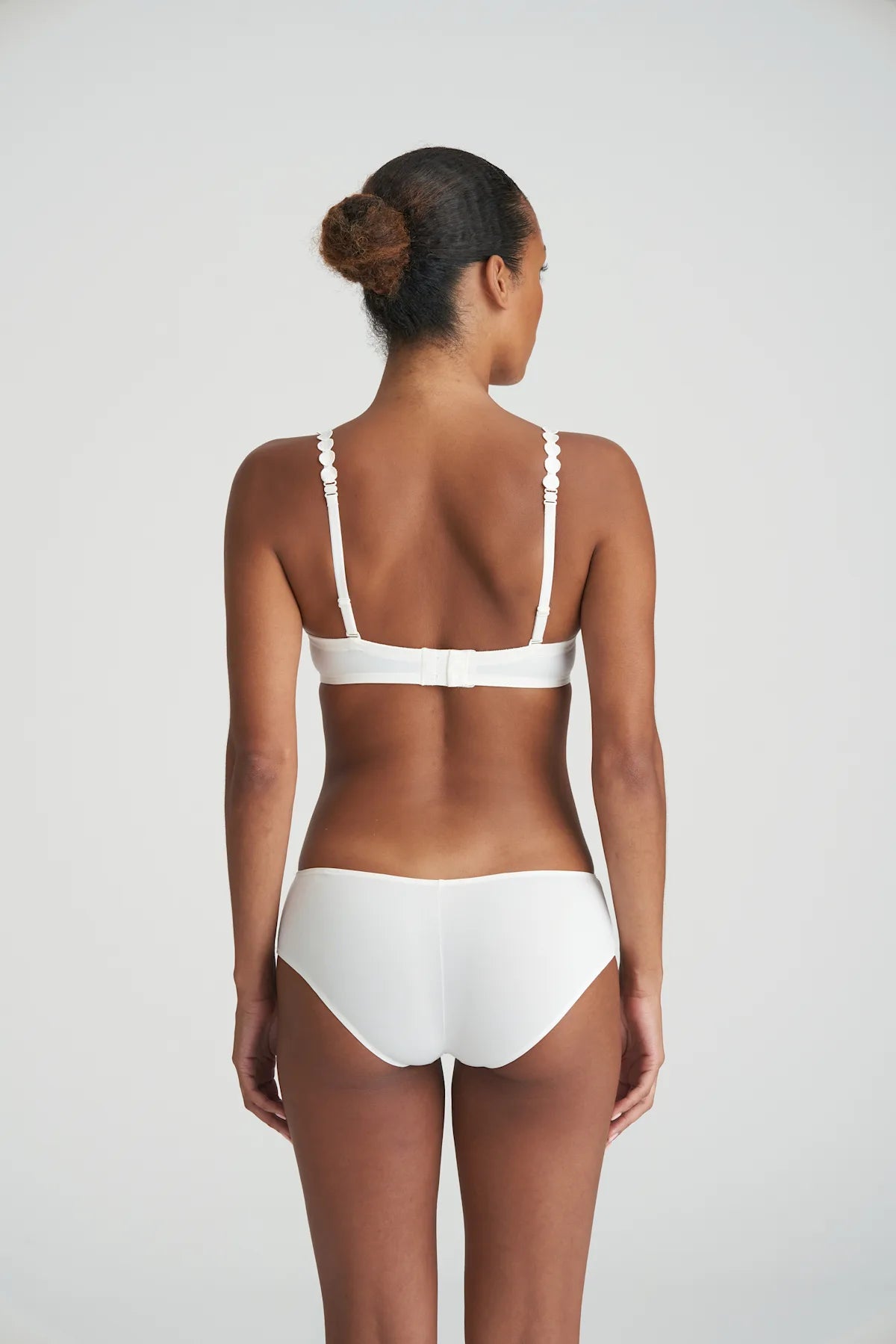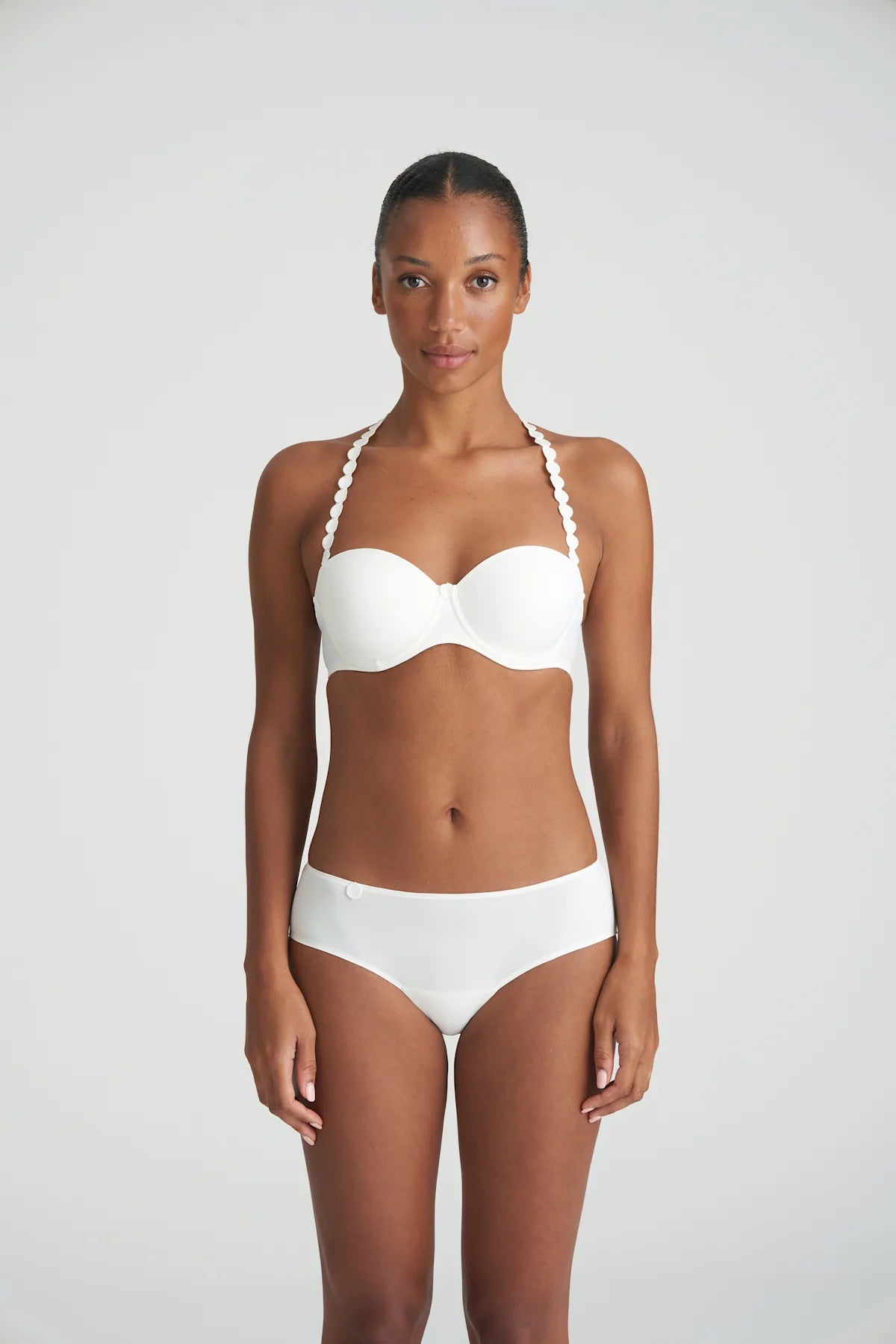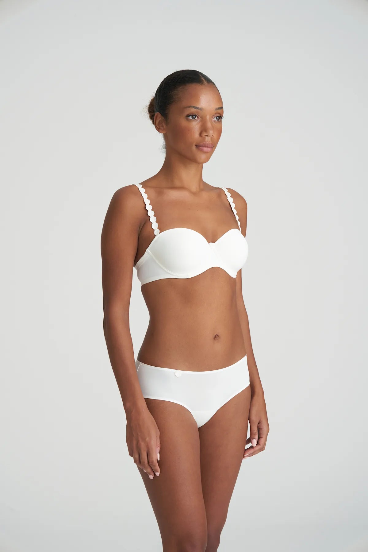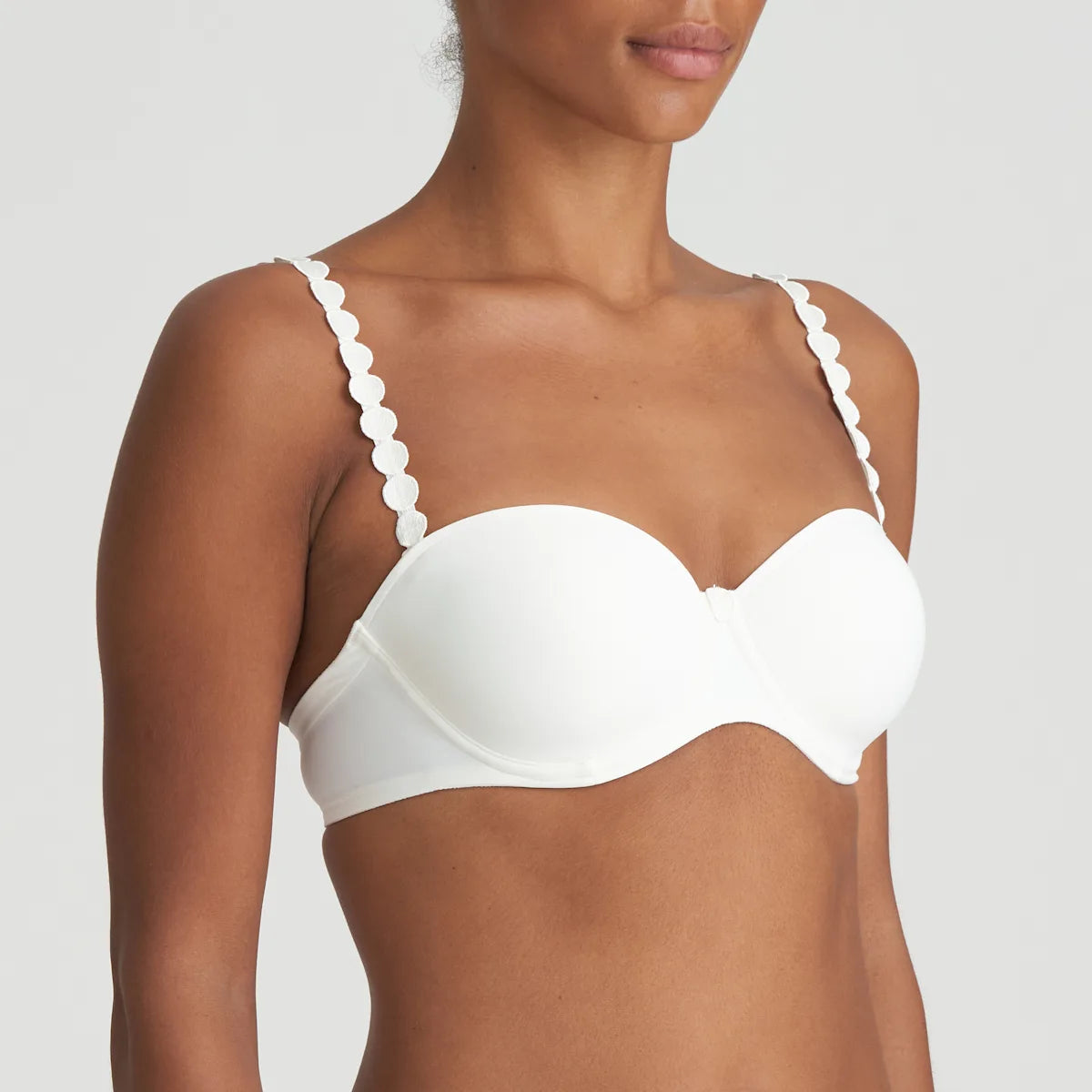 A strapless bra with the shape of a bandeau style. This bra has a straight back and a wide band made from stretch fabric for added support. Wear as a strapless bra or wear the straps over the shoulders or around the neck. A subtle softer take on white, Natural looks great against any skin type.