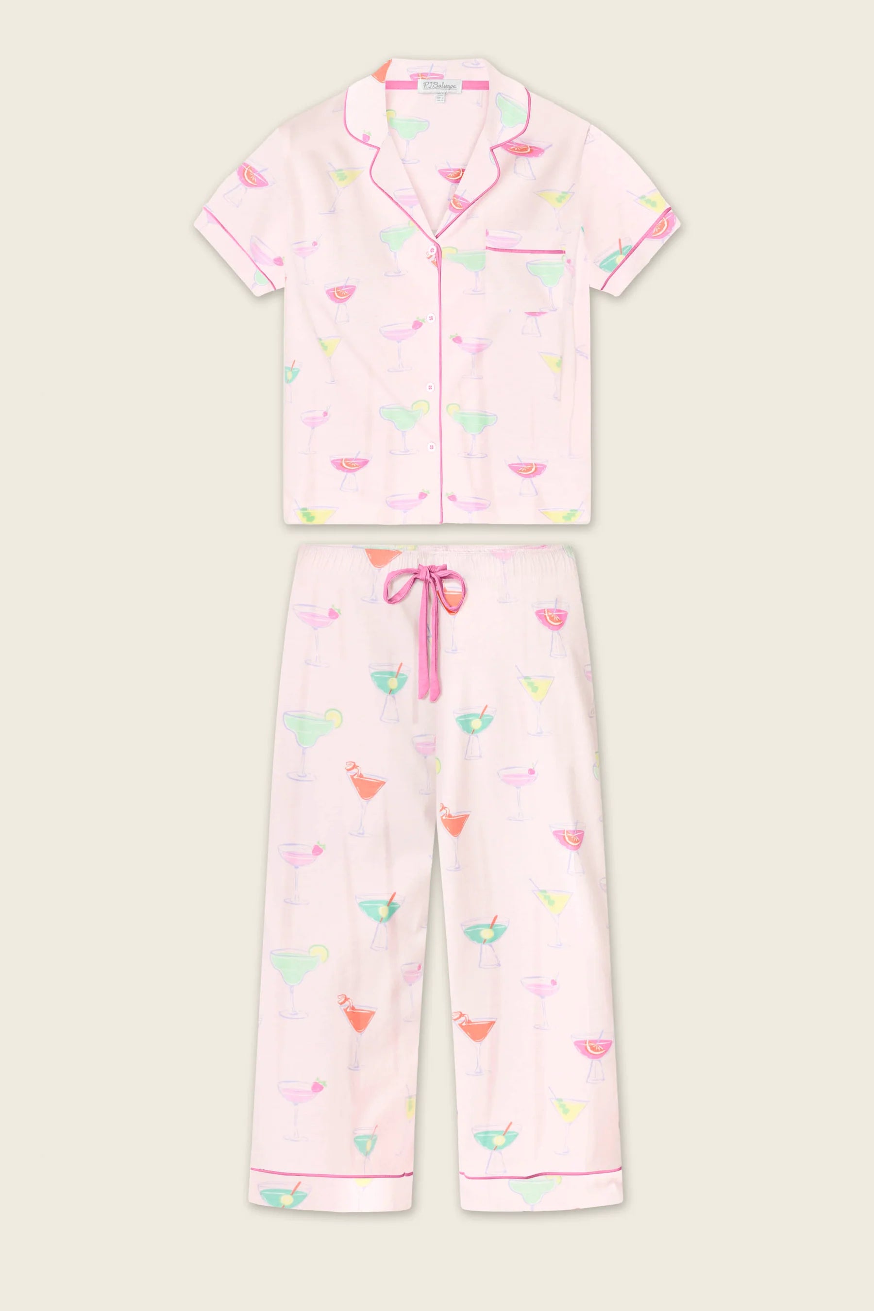 Women’s light pink pajama set featuring a short-sleeve button-down top with contrast piping, chest pocket, and matching pants with an elastic waistband and adjustable drawstring. Made from a soft cotton-modal jersey with a cocktail print.